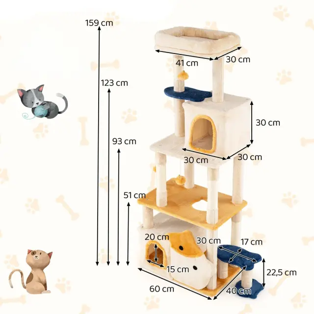 Zadovoljevanje instinktivnih potreb: Velik stolp za mačke ima več ploščadi in prikupno luknjo, ki spodbuja igro in raziskovanje. Plišaste igrače z zvončki in igrača s perjem izpolnjujejo naravne potrebe mačk in jih ohranjajo aktivne. Praskalniki iz sisala zagotavljajo dodatno zaščito pred poškodbami pohištva.