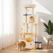 Udobna počivališča: Z izdatno oblazinjenim zgornjim sedalom se lahko mačke sprostijo in opazujejo okolico. Sedež je odstranljiv in pralen za enostavno čiščenje. Visoko mačje drevo, opremljeno z dvema mačjima domovanjema, ponuja udobno in zaščiteno zatočišče za več mačk.