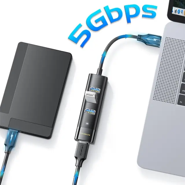 Priročna razširitev vrat: S štirimi USB 3.0 priključki lahko hkrati povežete več naprav, kot so miške, tipkovnice, tiskalniki, zunanji diski in USB ključki. To je idealno za uporabnike, ki imajo omejeno število USB priključkov na svojem računalniku. Predstavljajte si, kako lahko hkrati povežete miško, tipkovnico, zunanji disk in tiskalnik, ne da bi morali nenehno preklapljati med napravami. To vam bo prihranilo čas in povečalo vašo produktivnost.