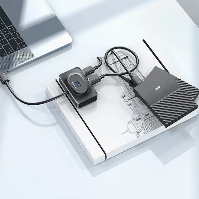 Kompakten in prenosen dizajn: Zaradi svoje kompaktne in lahke zasnove je ta USB razdelilnik idealen za uporabo doma, v pisarni ali na poti. Enostavno ga spravite v torbo za prenosnik ali nahrbtnik, tako da imate vedno na voljo dodatne USB priključke, kjer koli jih potrebujete.