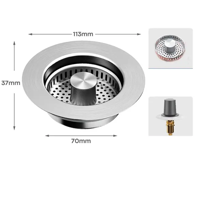 Učinkovito filtriranje: Prosimo, upoštevajte: to niso originalni deli. Z natančno izdelano perforirano košaro in priročnim bakrenim pokrovom ter palico, filter učinkovito zadržuje ostanke hrane in preprečuje zamašitev odtoka, kar ohranja vaš pomivalni prostor čist in brez neprijetnih vonjav.