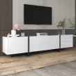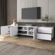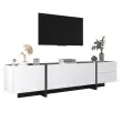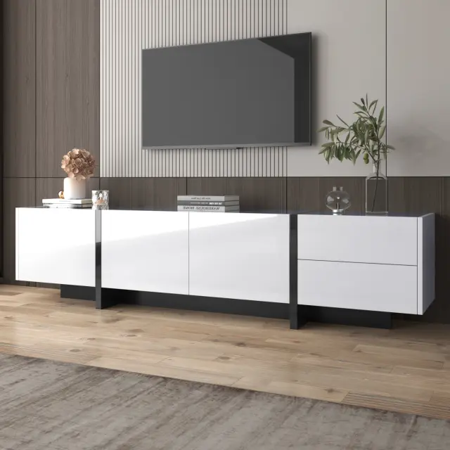 Visokosijajna belo-črna TV omarica z vrati in predali. Preprosta linijska oblika.