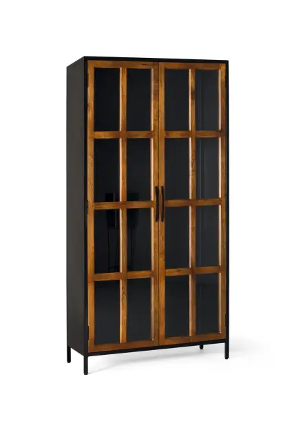Ta vitrina z dvojimi vrati, kovinskim okvirjem in vrati iz črnega in naravnega mangovega lesa je eleganten kos pohištva za predstavitev vaših zbirateljskih predmetov. Z višino 180 cm, dolžino 90 cm in širino 40 cm ponuja veliko prostora za shranjevanje, hkrati pa vašemu prostoru doda sodoben pridih. Izdelana je iz kovine in mangovega lesa ter predstavlja privlačen kontrast med črnim in naravnim lesom. Njena teža 65 kg zagotavlja optimalno stabilnost. Vitrina je dostavljena v škatli velikosti 184 x 194 cm in ne zahteva montaže. Izkoristite njeno elegantno obliko in funkcionalnost za predstavitev svojih najljubših predmetov, hkrati pa svoji notranjosti dodajte sodoben estetski pridih. Ker gre za kos naravnega lesa in ročno izdelanega pohištva, lahko ohrani svoje originalne grče in vzorec, zato se lahko barva razlikuje.