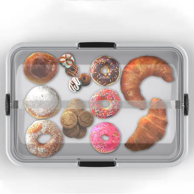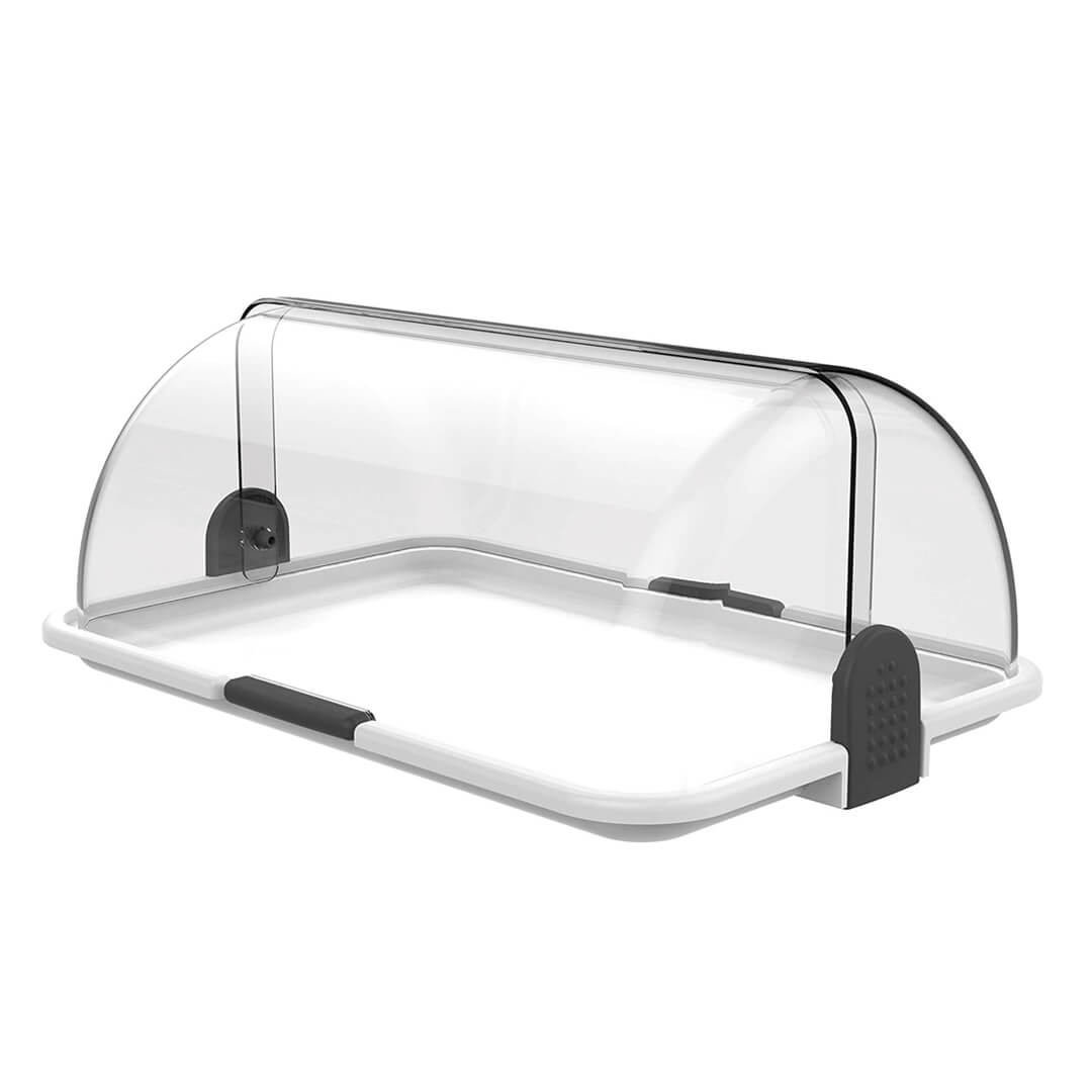Pravokotna vitrina za bife je popolna izbira za privlačno predstavitev peciva, tort, kolačkov ali drugih jedi na kuhinjskem pultu, v menzi, hotelu ali pri samopostrežnih zajtrkih. Hrano ohranja svežo in higiensko zaščiteno, obenem pa omogoča, da jo gostje vidijo in do nje zlahka dostopajo. Izdelana je iz plastike (brez BPA), ki jo je mogoče 100% reciklirati. Vitrina ima prozoren pokrov z zvitim zgornjim delom, ki omogoča odpiranje z obeh strani. Njena pregledna zasnova omogoča jasen pogled na razstavljena živila, hkrati pa jih ščiti pred zunanjimi vplivi. Pladenj dimenzij 38 × 26 cm nudi dovolj prostora za različne vrste slaščic ali prigrizkov, površina pa je enostavna za čiščenje in vzdrževanje. Zaradi svoje vsestranskosti in elegantne oblike je odlična rešitev za profesionalno uporabo v gostinstvu ali domačo rabo pri postrežbi bifejev. Primerna je za pomivanje v pomivalnem stroju.