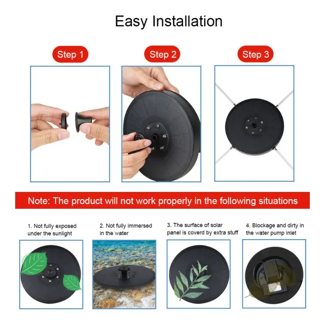 1. Ta izdelek je vodna črpalka na sončno energijo brez zunanje baterije. Višina vodnega curka je v celoti odvisna od moči sonca. Ko je sonce šibko, črpalka ne bo delovala neprekinjeno, ampak se bo samodejno zagnala, dokler ne bo imela dovolj energije, da se vrne v način neprekinjenega delovanja. Izdelek postavite na neposredno in prosto sončno svetlobo. V senci črpalka ne prejme dovolj energije za normalno delovanje.