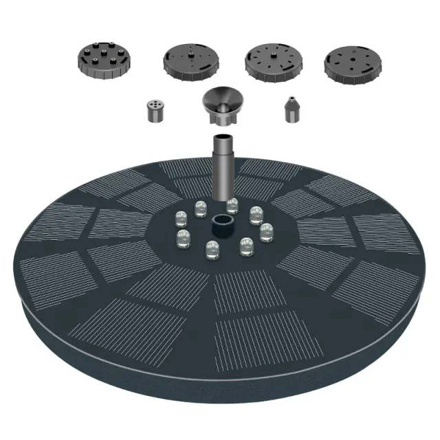 6 različnih šob: Izbirate lahko med 6 različnimi zamenljivimi šobami, da dosežete različne učinke na pršeno vodo. Ne pozabite, da mora biti črpalka za fontano pokrita z vodo, da lahko deluje.