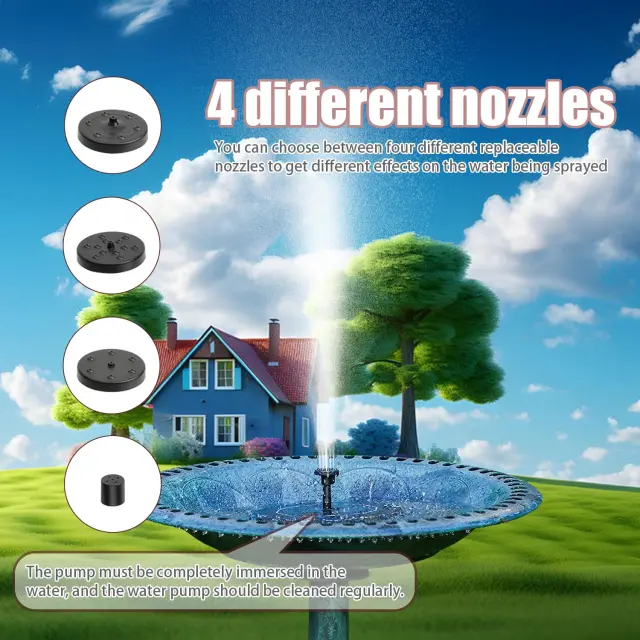 4 različne šobe: Izbirate lahko med 4 različnimi zamenljivimi šobami, da dosežete različne učinke na pršeno vodo. Ne pozabite, da mora biti črpalka za fontano pokrita z vodo, da lahko deluje.