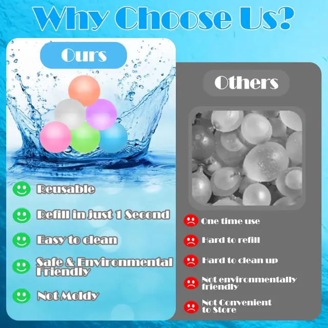 Daover predstavlja komplet štiriindvajsetih vodnih bomb za večkratno uporabo, ki so posebej zasnovane za nepozabne poletne tematske zabave in druženja na prostem. Te inovativne vodne krogle so izdelane iz visokokakovostnega silikona, ki je popolnoma varen, brez vonja in prijazen do okolja. Zaradi izjemno gladke površine in mehkega materiala lahko starši popolnoma zaupajo varno igro svojih otrok brez skrbi za morebitne poškodbe. Izdelek predstavlja sodobno alternativo tradicionalnim balonom, saj omogoča dolgotrajno uporabo brez ustvarjanja nepotrebnih odpadkov po končani igri.