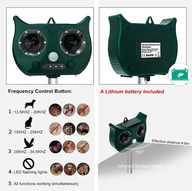 Odganjalec škodljivcev se napaja s sončnimi celicami, lahko pa ga tudi polnite s priloženim kablom Micro-USB. Zvok strašila lahko prilagodite glede na to, kakšne živali želite odgnati stran, saj so nekatere bolj občutljive od drugih. Nastavljivo med 13,5-40 kHz.