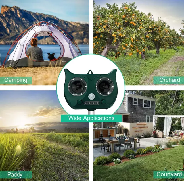 Borite se proti škodljivcem s tem ultrazvočnim odganjalcem škodljivcev s senzorjem PIR, ki zaznava premikajoče se predmete in hkrati oddaja zvok 120 dB z ultrazvočnimi valovi. Njegova utripajoča lučka odžene žuželke in druge živali, ki se jim na vrtu želite izogniti. Zvok lahko slišijo samo živali, zato vas ultrazvočna frekvenca ne bo motila.