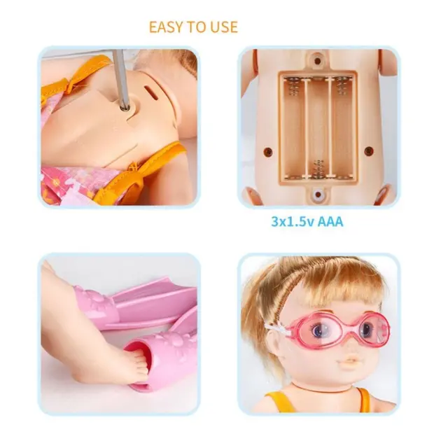 Lutka deluje na baterije, vendar je dobro poskrbljeno za vodoodpornost, zato lahko lutka plava v vodi. Uporabite jo lahko za vse vodne aktivnosti: kopanje v bazenu, domači kadi, jezeru ali morju.
