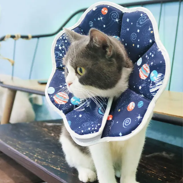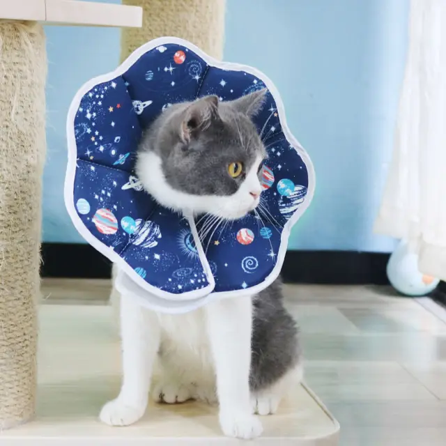 Vodoodporna in proti lizanju: Ta mačja Elizabetanska ovratnica z vzorcem planetov je izdelana iz vodoodporne kompozitne tkanine, ki zagotavlja pregrado pred vlago in preprečuje, da bi vaša mačka lizala rane, šive ali kožne bolezni. Vodoodporna lastnost zagotavlja enostavno čiščenje in higieno, medtem ko zasnova proti lizanju spodbuja hitrejše celjenje in preprečuje okužbe. Idealna za okrevanje po operaciji, zdravljenje kožnih draženj ali obvladovanje vedenjskih težav, ta ovratnica ponuja udobno in učinkovito rešitev za dobro počutje vaše mačke. Mehak material zmanjšuje stres in omogoča vaši mački, da se prosto giblje, medtem ko ostaja zaščitena. Je nepogrešljiva za odgovorne lastnike hišnih živali.