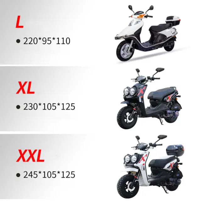 Vrhunska zaščita pred vremenskimi vplivi: Zaščitite svoje motorno kolo, električno kolo ali kolo pred vremenskimi vplivi z našo vrhunsko prevleko za motorno kolo. Izdelana iz visokokakovostnega 190T poliestrskega materiala s srebrno prevleko, ta prevleka zagotavlja izjemno zaščito pred dežjem, prahom in sončno svetlobo. Ohranite svoje vozilo v najboljšem stanju, ne glede na vremenske razmere. Srebrna prevleka odbija sončno svetlobo, preprečuje pregrevanje in bledenje barve vašega motornega kolesa. Ta prevleka je idealna za shranjevanje v zaprtih prostorih in na prostem, kar zagotavlja, da vaše vozilo ostane čisto in zaščiteno skozi vse leto. Je stroškovno učinkovita rešitev za ohranjanje vrednosti in videza vašega motornega kolesa.