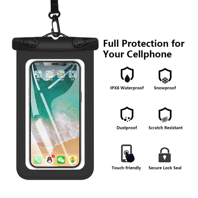 Etui je vodoodporen, odporen na sneg in prah ter je primeren za mobilne telefone do 7 inčev. Etui ne vpliva na nobeno funkcijo telefona in tako zaslon na dotik kot stranske gumbe lahko uporabljate tudi v vodi.