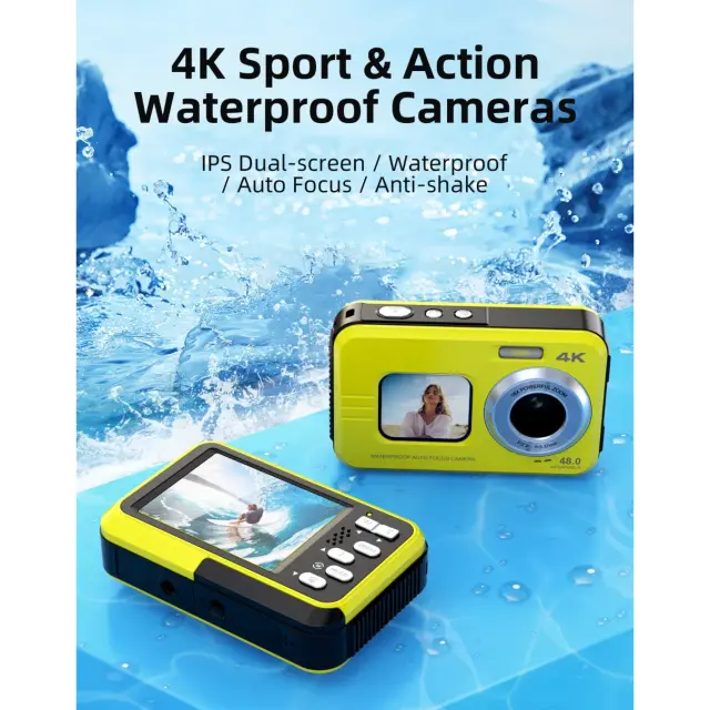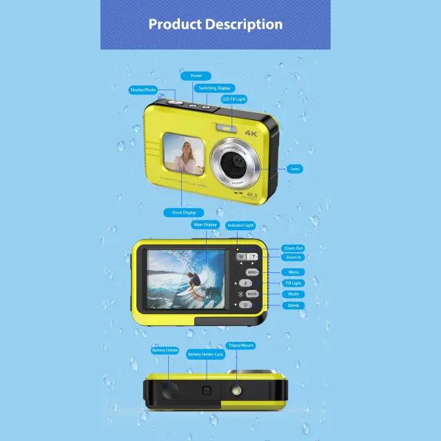 Dvojni zasloni: Podvodna kamera ima 2 zaslona za preprosto fotografiranje selfijev. 1,7-palčni HD zaslon na sprednji strani omogoča preprosto fotografiranje avtoportretov, 2,8-palčni HD zaslon na zadnji strani pa vam omogoča bolj jasno opazovanje subjekta med fotografiranjem.