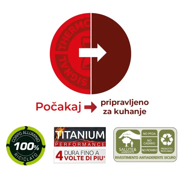 Lagostina vok (wok) New Rigenera Green, z dolgim ročajem in premerom 28 cm, je prva ekološko trajnostna linija proti prijemanju hrane, blagovne znamke Lagostina, ki je izdelana iz 100% recikliranega aluminija. Linija vključuje izdelke proti prijemanju z ekskluzivnim večplastnim premazom, odpornim na praske, z ojačano titanovo podlago (Titanium Performance). Ecolabel, varen in trpežen premaz, je popolno jamstvo, da vok v svojem dolgem ciklu uporabe ohrani svoje lastnosti nedotaknjene, ne vsebuje kadmija in svinca, je brez PFOA. Ohišje iz 100% aluminija je mogoče reciklirati, s čimer se zmanjša njegov vpliv na okolje. Vok je opremljen tudi za Lagospot - ekskluzivnim indikatorjem temperature, ki prikazuje idealen trenutek za začetek kuhanja. Primeren je za kuhanje na vseh kuhalnih površinah, tudi indukciji. Lahko ga pomijete v pomivalnem stroju.