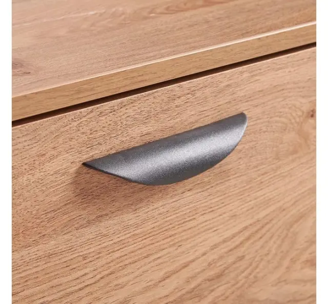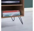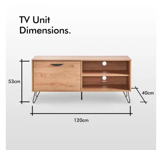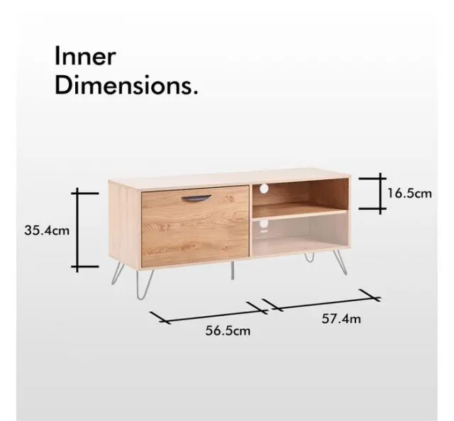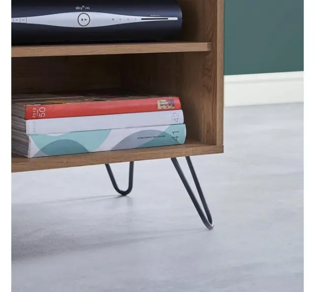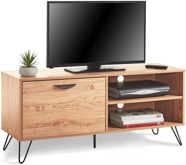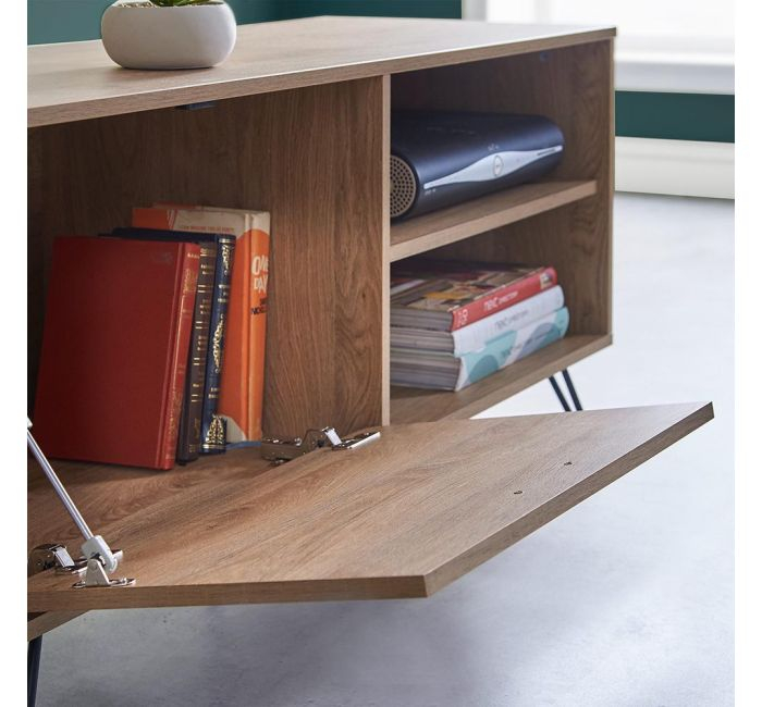 VonHaus Capri manjša TV omarica je lahko tudi samostojna omarica za shranjevanje. Na pogled tradicionalna, v barvi hrasta, jo močne, črne, jeklene noge naredijo elegantno in trendi. Na eni strani vam je na voljo izvlečni predal, na drugi pa dve robustni polici z izrezom na hrbtni strani za kable, da ti ne bodo vidni.