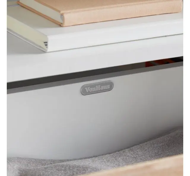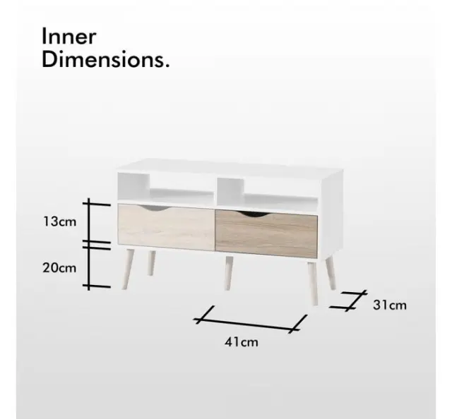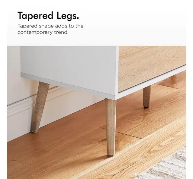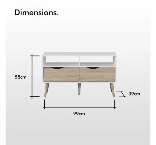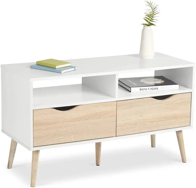VonHaus Koto manjša TV omarica je lahko tudi samostojna omarica za shranjevanje. Skandinavski dizajn, visokih, stožčastih nog ujemajočega hrastovega zaključka pa jo naredi še posebej moderno. Za shranjevanje so vam na voljo odprt zgornji del z dvema policama in dva predala z domiselnimi ročaji.