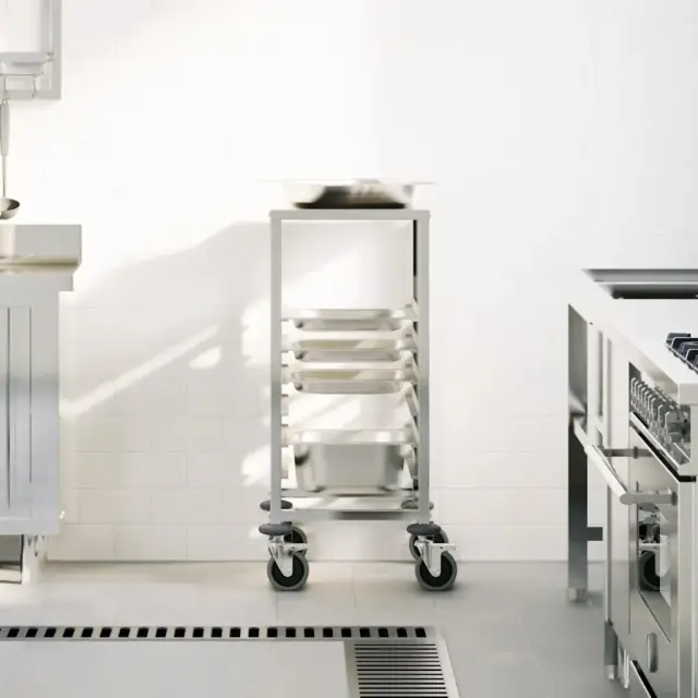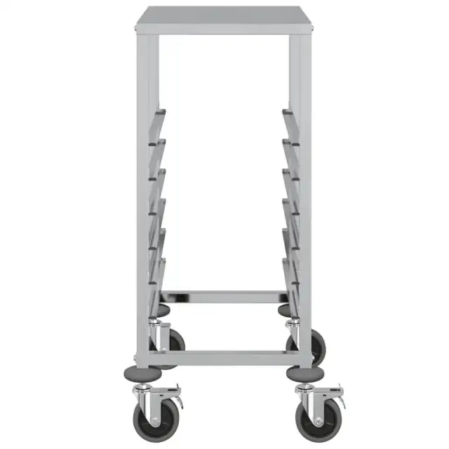 Ta voziček za pladnje je izdelan iz nerjavečega jekla, zasnovan za dolgo življenjsko dobo in odpornost proti koroziji. Ponuja prostor za do 6 GN 1/1 posod z največjo globino 65 mm, združljiv je tudi z drugimi velikostmi GN posod. Opremljen je s štirimi tihimi vrtljivimi kolesi, od katerih imata dve zavoro za stabilnost. Kompaktna in ergonomska zasnova omogoča učinkovito shranjevanje in enostavno premikanje, idealno za kuhinje z omejenim prostorom. Zgornja platforma nudi dodatni prostor za kuhinjske pripomočke in je enostavna za čiščenje. Opomba: pladnji niso vključeni v dostavo.