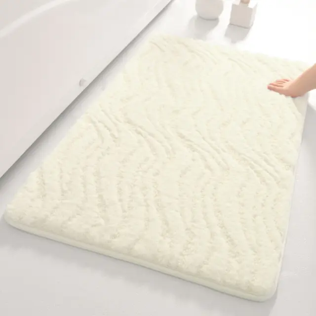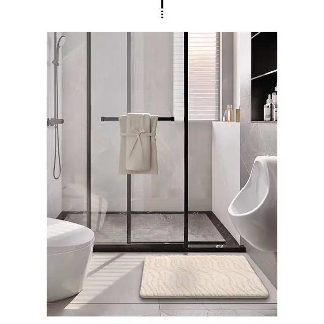 Izjemno vpojni material: Ta kopalniška preproga je izdelana iz visokokakovostnih poliestrskih vlaken in odlično vpija vodo ter tako ohranja vaša tla v kopalnici suha in varna. Izjemna vpojnost zagotavlja udobno in suho izkušnjo vsakič, ko stopite izpod prhe ali kadi.
