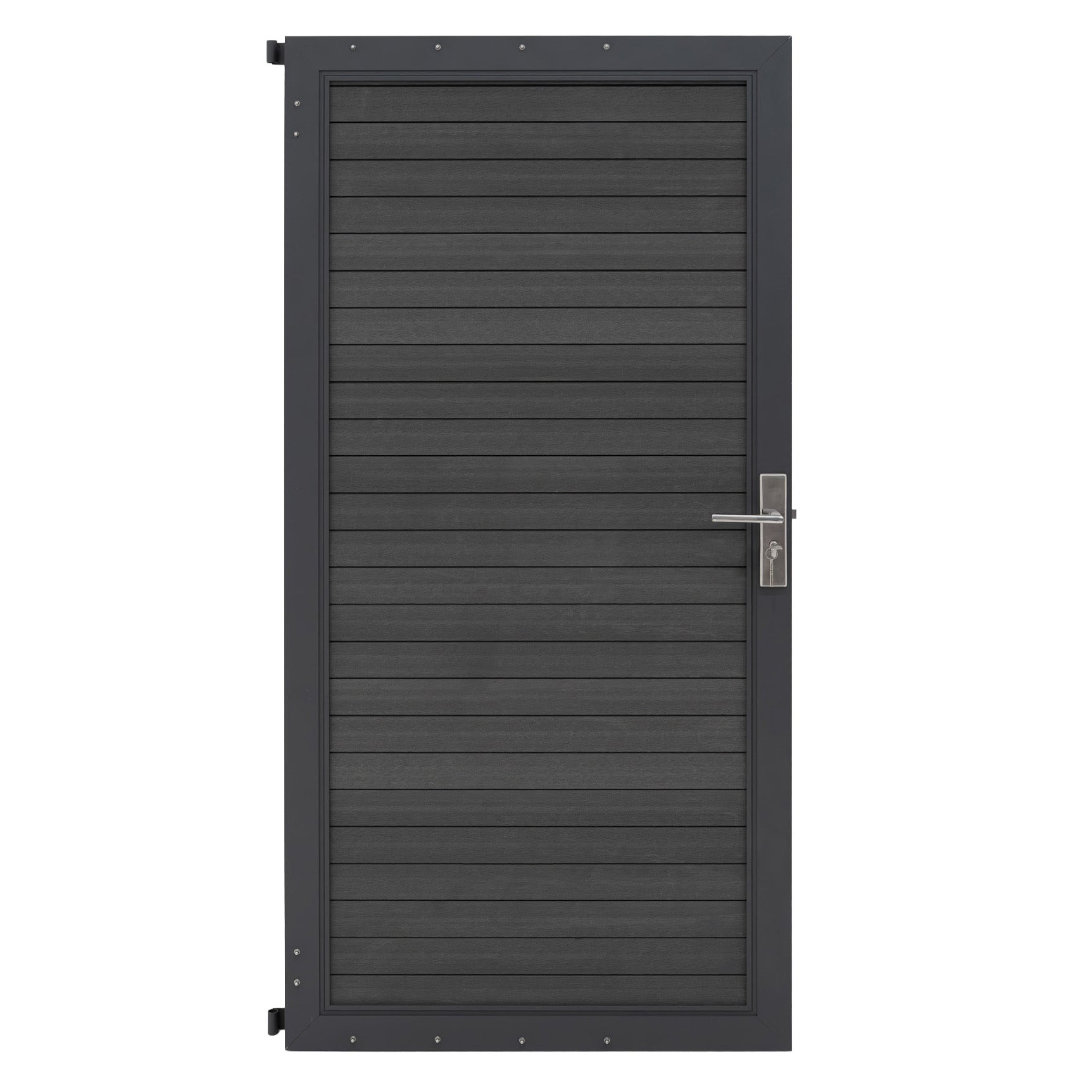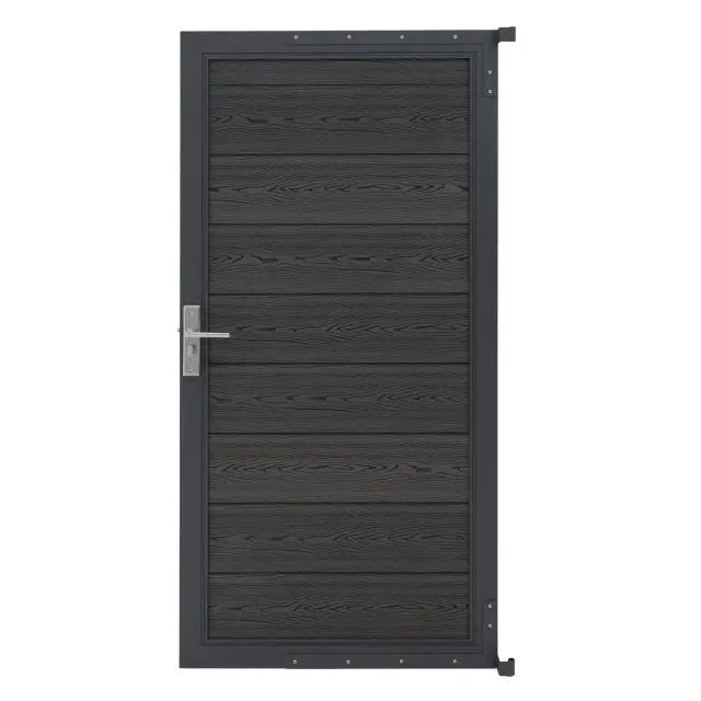 Vrata, strokovno izdelana iz vrhunskega WPC (lesno-plastičnega kompozita) in ojačana z robustnim aluminijastim okvirjem, združujejo estetsko privlačnost s strukturno trdnostjo. Njihova sestava vključuje devet medsebojno povezanih letvic, ki tvorijo eno trdno, zanesljivo panelno ploščo, ki sčasoma ohranja svojo celovitost in videz. Aluminijast okvir ne le dodaja trdnost, temveč ima tudi vsestranski pritrdilni element, zasnovan tako, da omogoča enostavno namestitev na različne stebre ali obstoječe konstrukcije z uporabo predhodno izvrtanih pritrdilnih točk.