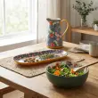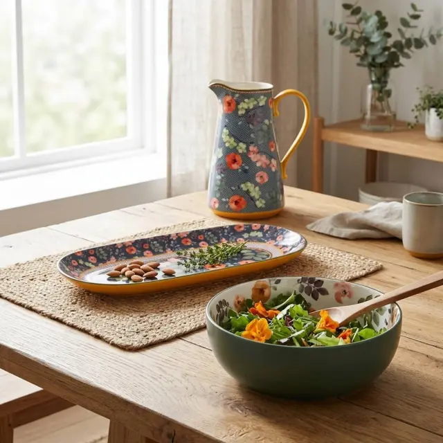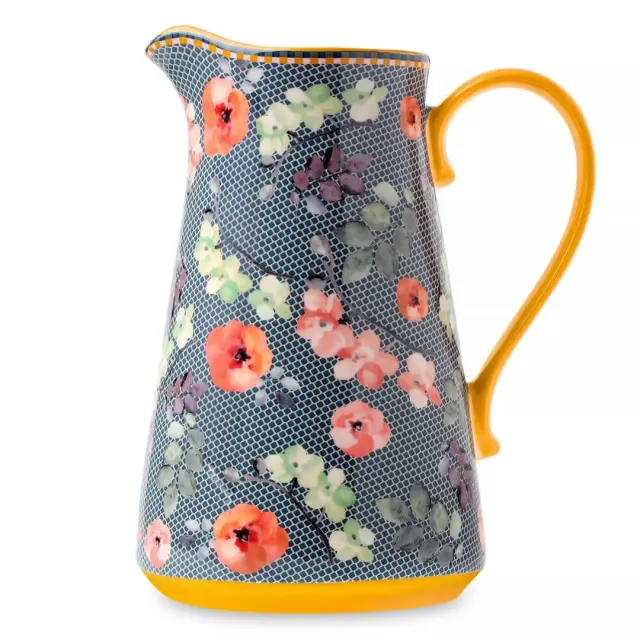 Vrč Arcadia s prostornino 2,5 litra ima ročno poslikan dizajn s cvetličnimi in geometrijskimi motivi, s toplo paleto barv in eklektičnim, vintage pridihom. Izdelan je iz kakovostne keramike Stoneware in bo družinskim obrokom, večerjam in posebnim priložnostim dodal barvo in značaj. Primerno za mikrovalovno pečico in pomivanje v pomivalnem stroju.