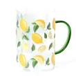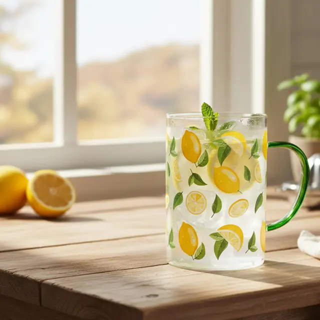 Vrč iz borosilikatnega stekla je odlična izbira za postrežbo vode, limonade ali drugih napitkov. Odlikuje ga zelen ročaj, ki doda barvni poudarek in omogoča udoben ter varen oprijem. Prosojno steklo poudari čist dizajn in vsebino vrča, hkrati pa je borosilikatno steklo lahko in odporno na temperaturne razlike. Za ohranitev barve ročaja in motiva limon priporočamo ročno pomivanje.