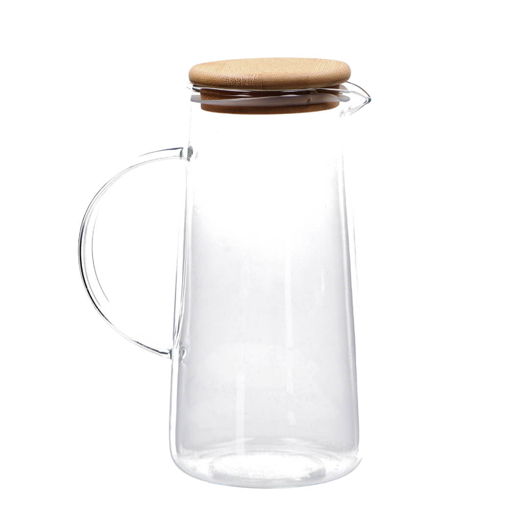 Stekleni vrč z bambusovim pokrovom je popoln dodatek za vaše družabne dogodke in večerne zabave. Bambusov pokrov dodaja naraven in topel pridih, ki se čudovito ujema s prozornim borosilikatnim steklom vrča, hkrati pa zagotavlja, da pijača ostane sveža in zaščitena pred zunanjimi vplivi. Vrč omogoča preprost prikaz barvite vsebine, kar bo zagotovo očaralo vaše goste. Primeren je za različne vrste pijač, od osvežilnih limonad in sadnih sokov do prefinjenih koktajlov. Primeren je za pomivanje v pomivalnem stroju (brez pokrova).