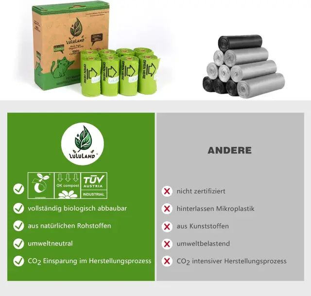 Vrečke za pasje iztrebke LULULAND predstavljajo ekološko in praktično rešitev za vsakega odgovornega skrbnika štirinožca, ki želi ohraniti čistočo v naravi. Izdelane so iz koruznega škroba, kar zagotavlja popolno razgradljivost in zmanjšuje obremenjevanje okolja s plastičnimi odpadki. Njihova uporaba je primerna za vsakodnevne sprehode v parkih, na mestnih pločnikih ali med daljšimi potovanji s hišnim ljubljenčkom. Zaradi močne konstrukcije in neprepustnosti omogočajo higienično odstranjevanje odpadkov brez tveganja za puščanje ali trganje materiala.
