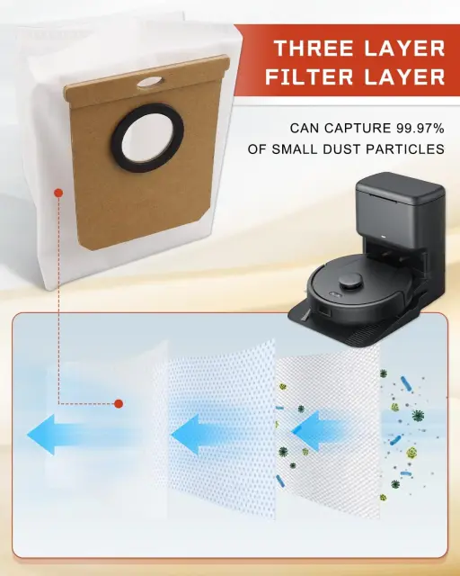 Popolno prileganje: vrečke za prah so posebej zasnovane za namestitev na robotske sesalnike Conga Home 10000, 8090 Ultra in 9090 AI, kar zagotavlja popolno prileganje za optimalno učinkovitost čiščenja.