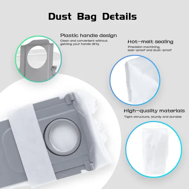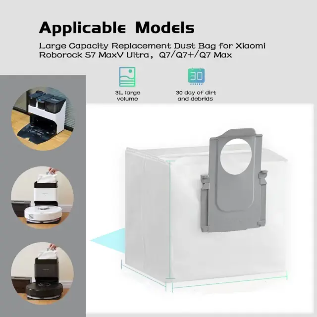 Vrečke za sesalnik so primerne za robotske sesalnike Xiaomi Roborock S7 MAXV Ultra / S8 / S8 Pro S8+ / T8 / Q7 / Q7 MAX / Q7 MAX+. So tesni in vzdržljivi ter jih je enostavno zamenjati brez razlitja.