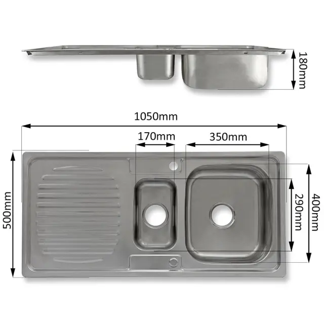 Skupne dimenzije kuhinjskega pomivalnega korita so približno 1050 mm x 500 mm in za namestitev boste potrebovali delovno ploščo, izrezano približno 1030 mm x 480 mm. Na voljo so vnaprej preluknjane 35 mm luknje za pipo, ki vam omogočajo izbiro levega ali desnega odcejalnika, odvisno od vaših želja in postavitve vaše kuhinje.