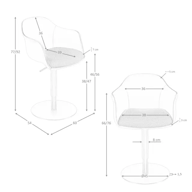 - Nastavljiva višina s sistemom dviga s plinskim batom, ki omogoča natančno prilagoditev sedeža na različne višine ter zagotavlja večje udobje, vsestranskost in optimalno ergonomijo.