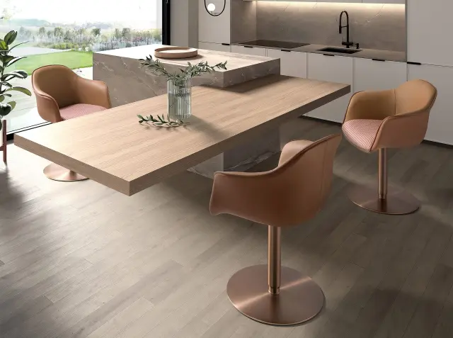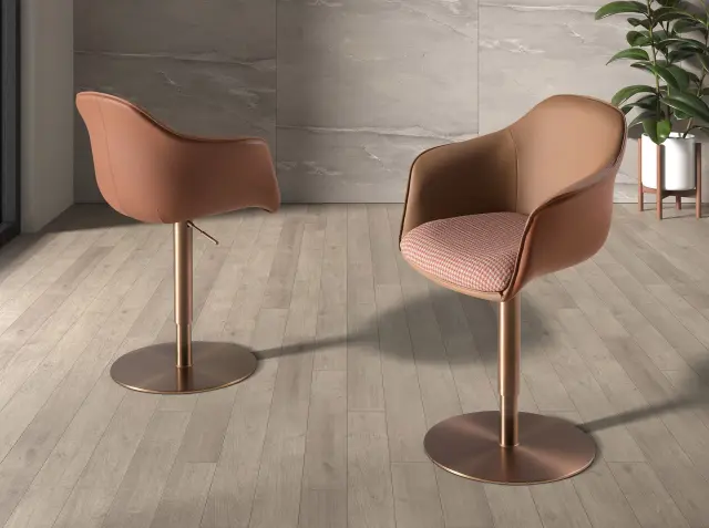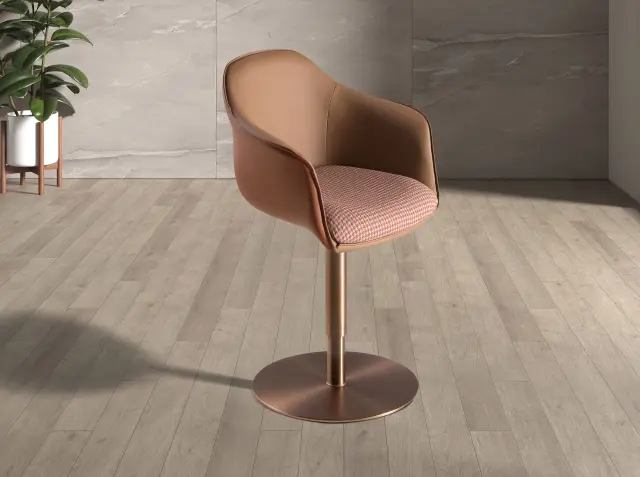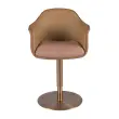 Vrtljiv stol z nasloni za roke sodobnega dizajna s sedežem, oblazinjenim v terakota rjavo in bež tkanino, ter naslonjalom v rjavo umetno usnje. Noge iz poliranega nerjavečega jekla v barvi rožnatega zlata, v avantgardnem in hkrati brezčasnem slogu ga naredijo nepogrešljivega v kuhinji ali jedilnici. Ta stol znamke Angel Cerdá združuje edinstven slog z največjim udobjem in stabilnostjo zaradi kakovostnega oblazinjenja in originalne konstrukcije nog. Nastavljiva višina sedeža omogoča prilagoditev glede na potrebe ter zagotavlja večje udobje.