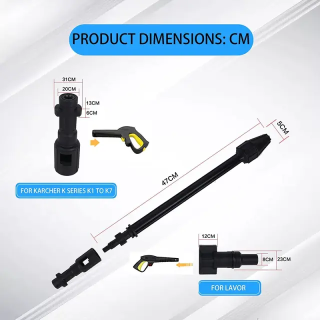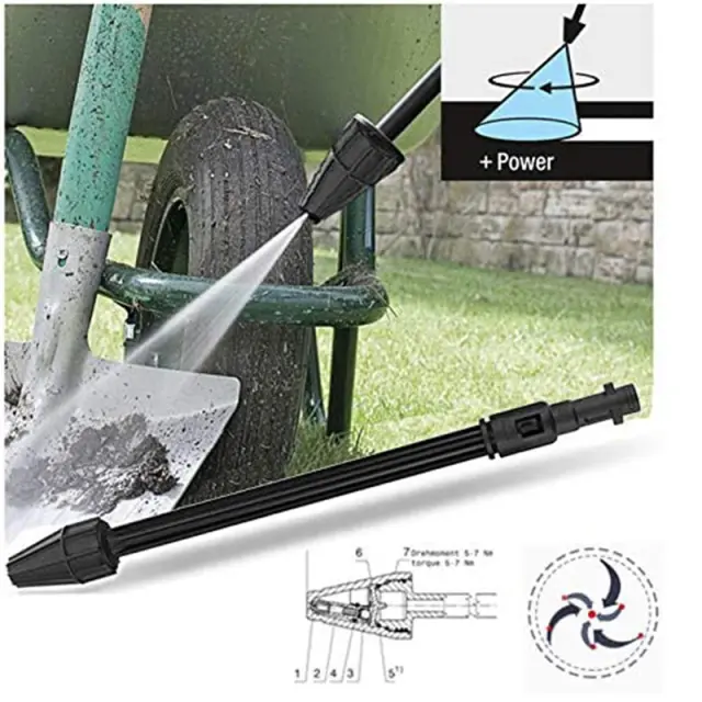 Pršilna cev je združljiva z električnimi tlačnimi čistilniki Kärcher K2/K3/K4/K5/K6/K7. Popoln za težko dostopna mesta in trdovratne madeže. Pripomoček je primeren za čiščenje betona, pločnikov, dovozov, teras, krovov, ograj, ograj itd.