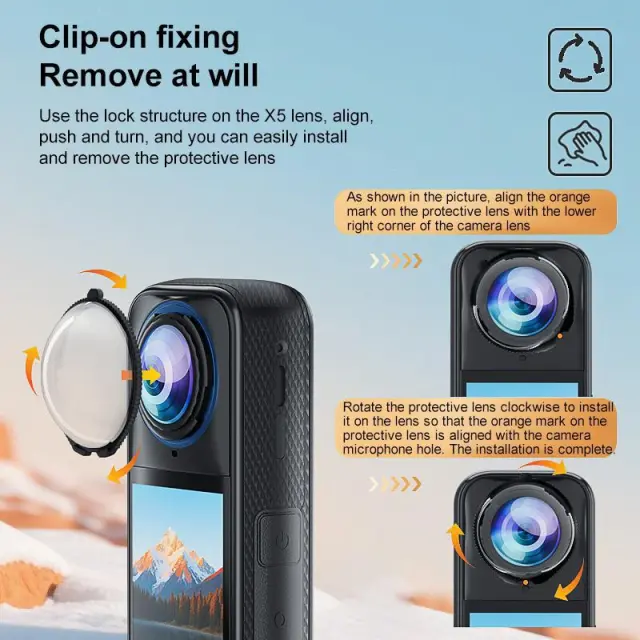 Enostavna namestitev: Uporabniku prijazen dizajn omogoča hitro in enostavno namestitev in odstranitev brez potrebe po orodju. Preprosto pritrdite zaščito leče na vašo Insta360 X5 in že ste pripravljeni. Vrtljivi mehanizem omogoča enostavno prilagajanje in pozicioniranje, kar zagotavlja varno prileganje in optimalno pokritost. Njena lahka konstrukcija doda minimalno količino vaši kameri, ohranja njeno elegantno obliko in prenosljivost. Porabite manj časa za nastavitev in več časa za zajemanje neverjetnih trenutkov s to priročno in praktično zaščito leče.