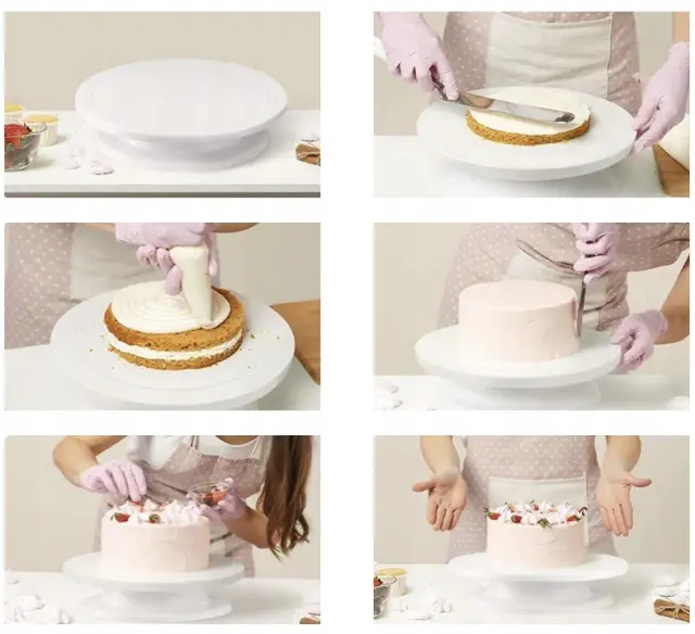 VRTLJIV – zahvaljujoč dejstvu, da je plošča vrtljiva, lahko kdorkoli preprosto okrasi torto z vrtenjem stojala . Lahko pa posežete po pecivu, ki ga zanima na določenem mestu na krožniku.