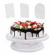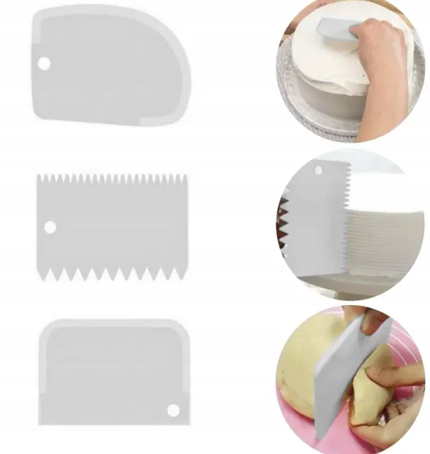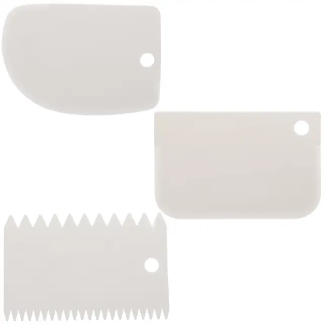 3 LOPATKE ZA DEKORACIJO – 3 okrasne lopatke so pritrjene na krožnik, z njimi razmažemo in zgladimo maso. Vsak od njih ima drugačen vzorec. Zahvaljujoč njim bo vsak vzorec na torti zanimiv.