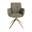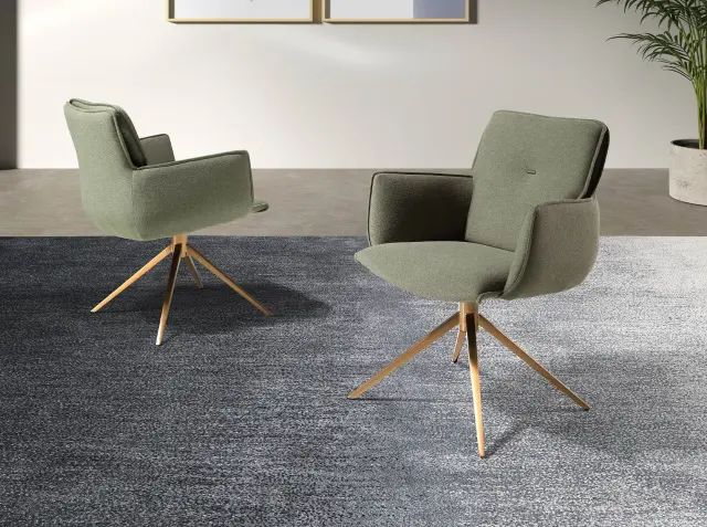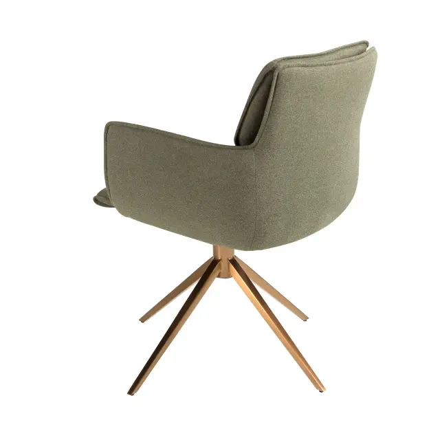 Sodoben vrtljiv stol z nasloni za roke ter sedežem in naslonjalom, oblazinjenima v olivno zeleno tkanino. Noge iz nerjavečega jekla, barvanega v bronasto barvo, v avantgardnem in hkrati brezčasnem slogu ga naredijo nepogrešljivega v kuhinji ali jedilnici. Stol blagovne znamke Angel Cerdá združuje edinstven in oseben slog znamke z največjim udobjem in stabilnostjo zahvaljujoč visoki kakovosti oblazinjenja in originalni konstrukciji nog