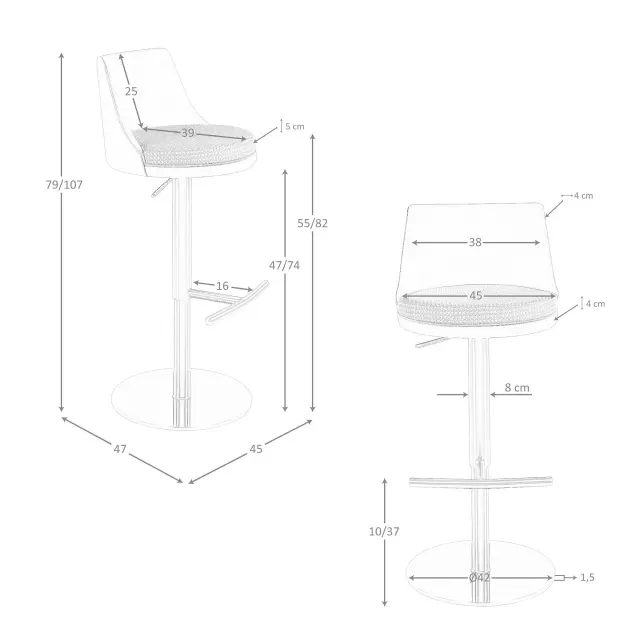 - Trdna konstrukcija in podstavek iz poliranega nerjavečega jekla v barvi rožnatega zlata skupaj z integriranim naslonom za noge zagotavljata stabilnost in vzdržljivost, zaradi česar je ta barski stol kos, ki združuje funkcionalnost, udobje in dizajn.