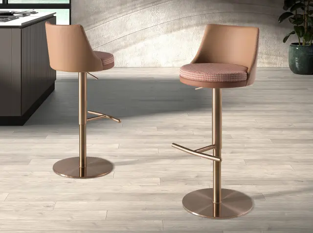 Vrtljivi stol z modernim dizajnom, sedežem, oblazinjenim s tkanino v barvi terakote in bež, ter naslonjalom, oblazinjenim z umetnim usnjem v barvi rjave. Noge iz poliranega nerjavečega jekla v barvi roza zlata, ki so avantgardne in hkrati brezčasne, bodo ta stol naredile za nepogrešljivega v vaši kuhinji ali jedilnici. Ta stol znamke Angel Cerdá združuje edinstven in oseben stil blagovne znamke ter večje udobje in stabilnost, zahvaljujoč visoki kakovosti oblazinjenja in izvirni strukturi nog. Njegov sedež, ki je nastavljiv po višini, omogoča prilagajanje glede na vaše potrebe, kar mu daje večje udobje.
