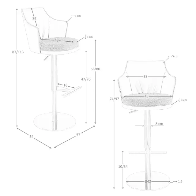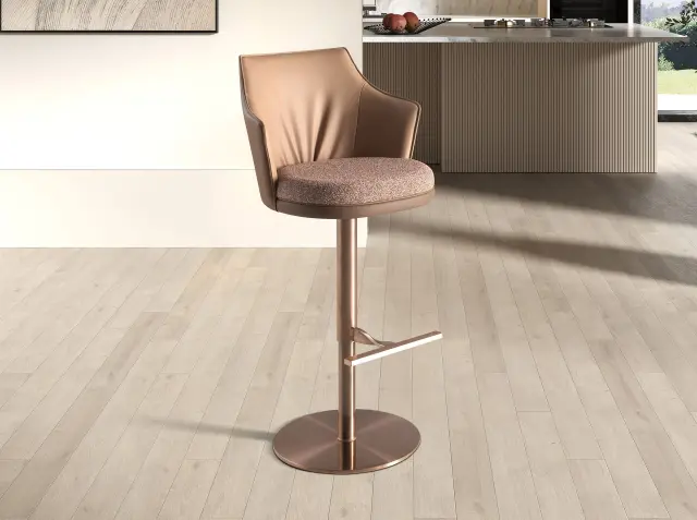 Vrtljiv barski stol z nasloni za roke sodobnega dizajna s sedežem, oblazinjenim v rjavo melirano tkanino, in naslonjalom v rjavo umetno usnje. Noge iz poliranega nerjavečega jekla v barvi rožnatega zlata, v avantgardnem in hkrati brezčasnem slogu, ga naredijo nepogrešljivega v kuhinji ali jedilnici. Ta stol znamke Angel Cerdá združuje edinstven slog z največjim udobjem in stabilnostjo zaradi kakovostnega oblazinjenja in originalne konstrukcije nog. Nastavljiva višina sedeža omogoča prilagoditev glede na potrebe ter zagotavlja večje udobje