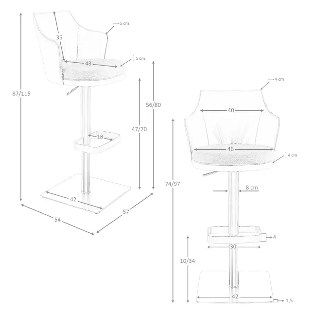 - Trdna konstrukcija in podstavek iz zatemnjenega poliranega nerjavečega jekla skupaj z integriranim naslonom za noge zagotavljata stabilnost in vzdržljivost, zaradi česar je ta barski stol kos, ki združuje funkcionalnost, udobje in dizajn.