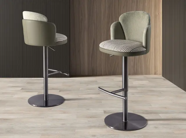 Vrtljivi stol z modernim dizajnom, sedežem, oblazinjenim s temno zeleno in belo tkanino, in naslonjalom, oblazinjenim z olivno zeleno umetno usnjo. Noge iz temno poliranega nerjavečega jekla v avantgardnem in hkrati brezčasnem slogu bodo ta stol naredile za nepogrešljivega v vaši kuhinji ali jedilnici. Ta stol znamke Angel Cerdá združuje edinstven in oseben stil blagovne znamke ter večje udobje in stabilnost, zahvaljujoč visoki kakovosti oblazinjenja in izvirni strukturi nog. Njegov sedež, ki je nastavljiv po višini, omogoča prilagajanje glede na vaše potrebe, kar mu daje večje udobje.