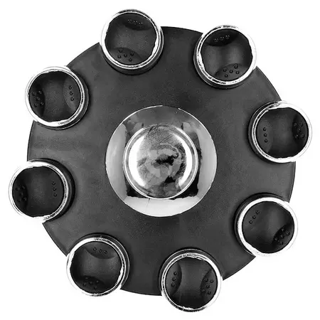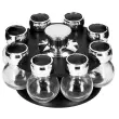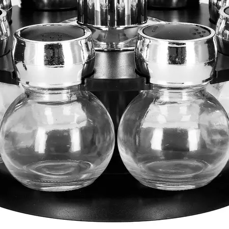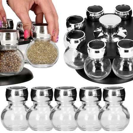 Parametri: Znamka: Springos Barva: črna Kozarci: steklo, s kromiranim pokrovom Material: plastika, kovina, steklo Količina kozarcev: 8 Vrtljivo podnožje: da Dodatno: izdelek primeren za stik z živili, vrtljiva struktura, dvofunkcijski dozirnik ( s cedilom /brez cedila), srebrn ročaj na sredini nosilca za vrtenje strukture Mere kozarca: Višina: 8 cm Najširši premer: 6 cm Premer zamaška: 4 cm Mere stojala: Višina: 13 cm Premer: 23 cm Premer podnožja: 17 cm Koda izdelka: KI0080