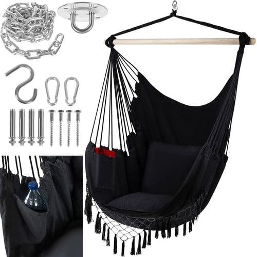SPECIFIKACIJA – barva: siva; material: tkanina / les / kovina; največja obremenitev: 150 kg; dolžina naglavnega traku 100 cm; dolžina verige: 2m; dimenzije vzglavnika: 45×45 cm; dimenzije po obešanju 150x100cm; dimenzije sedeža: 120x150cm; teža: 4.480 kg; teža v paketu: 4,498 kg.