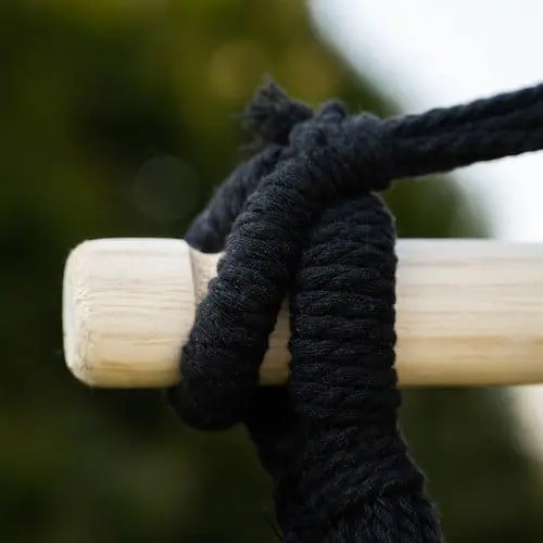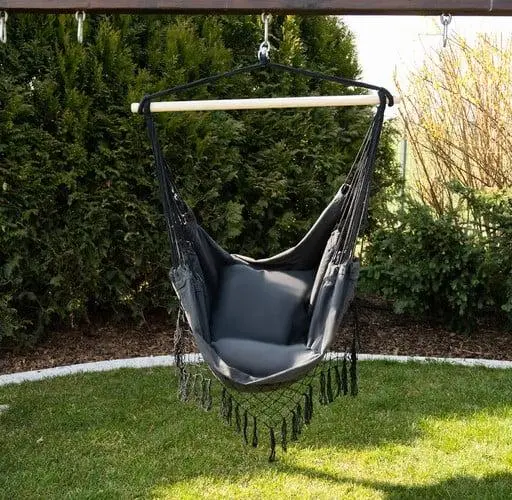 LESENA PREČKA – zahvaljujoč temu, da ima viseča mreža leseno prečko, omogoča udobno držo med sproščanjem. Lahko prosto berete in opazujete okolico . Popoln za trajno postavitev na vrtu, terasi ali v sobi.