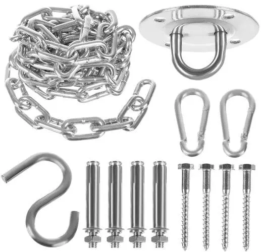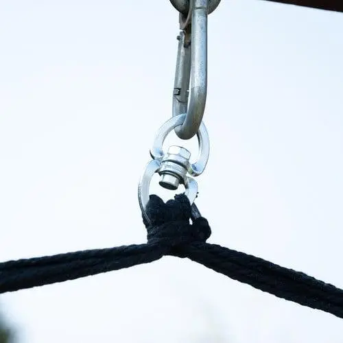 2 METROVSKA VERIGA – trdno, kovinsko montažno kolo je povezano s trpežnimi vrvmi , enakomerno razporejenimi po širini viseče mreže skozi leseno prečko. Ta oblika omogoča enostavno obešanje , viseča mreža pa je dobro uravnotežena in stabilna . Dodatna prednost je zelo dolga veriga za montažo, dolga do 2 metra za obešanje, tako da lahko visečo mrežo obesite tudi na visoko vejo.