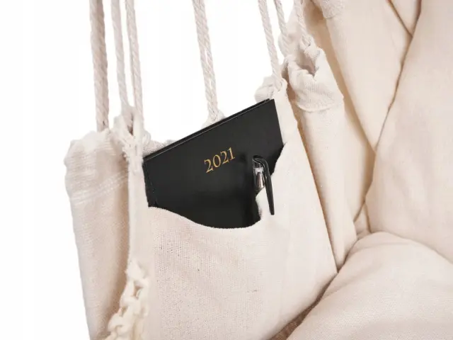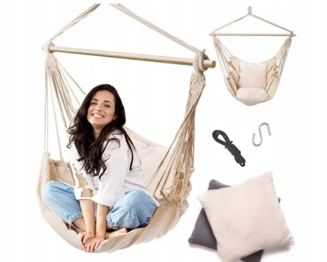 NARAVNI MATERIALI – zagotavlja ustrezno zračenje , ki ohranja udobje uporabe visečega stola tudi v vročih dneh . Trden, kovinski pritrdilni obroč je povezan s trpežnimi vrvmi , enakomerno razporejenimi po širini viseče mreže skozi leseno prečko. Ta oblika omogoča enostavno obešanje , viseča mreža pa je dobro uravnotežena in stabilna .
