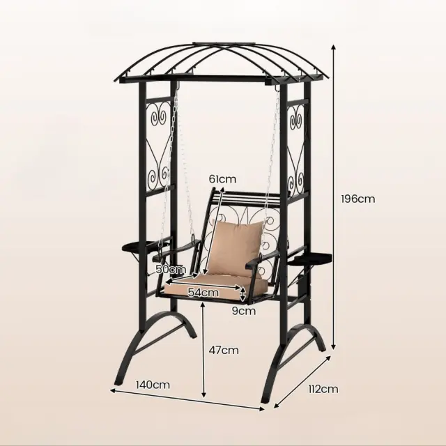 Z našo vrtno gugalnico spremenite svoj zunanji prostor v oazo sprostitve Ta vrtna gugalnica združuje po višini nastavljiv položaj za sedenje in robustno kovinsko konstrukcijo, ki prenese do 160 kg. Elegantno ukrivljen zgornji okvir in dve stranski rešetki zagotavljajo odlično podlago za plezajoče rastline. Mehke odstranljive blazine s peno visoke gostote zagotavljajo največje udobje, zložljivi stranski mizici z držali za skodelice pa ustvarjata praktične prostore za shranjevanje.